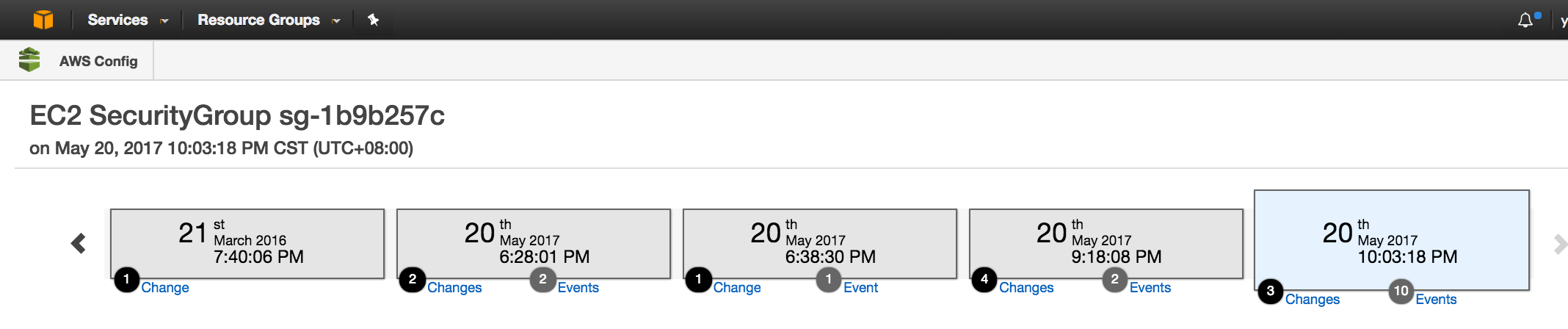 在AWS Config按照既定规则完成评估后,可以在规则的详细信息中查看到具体的变更事件记录:
