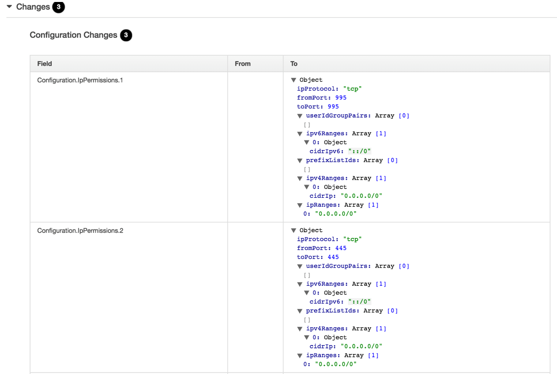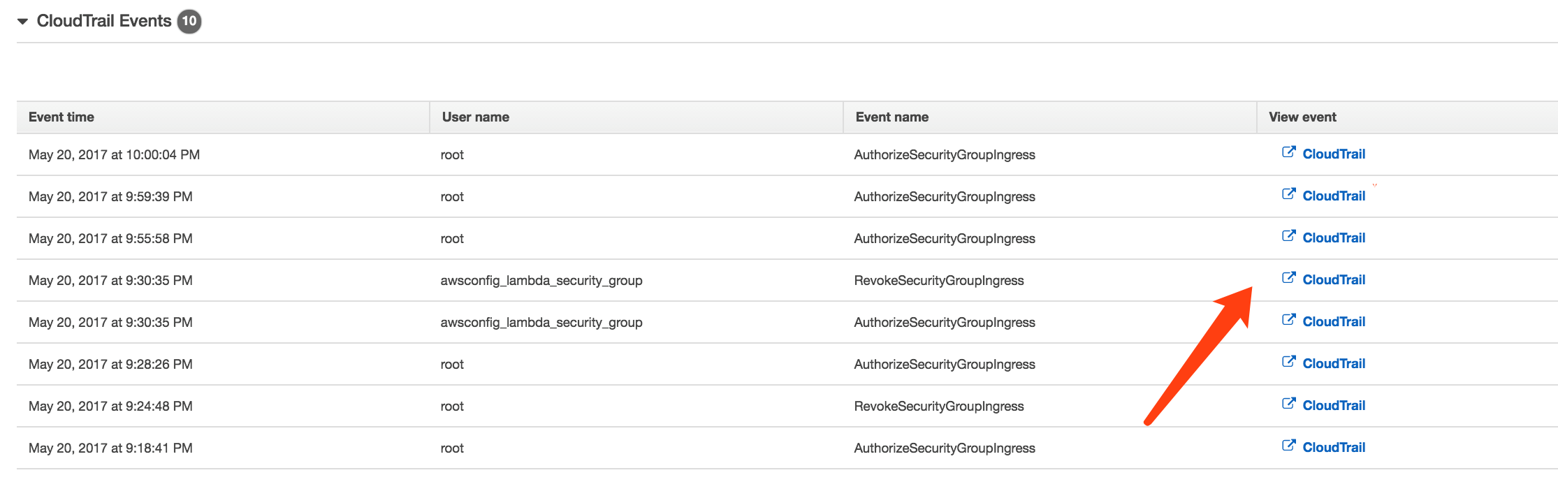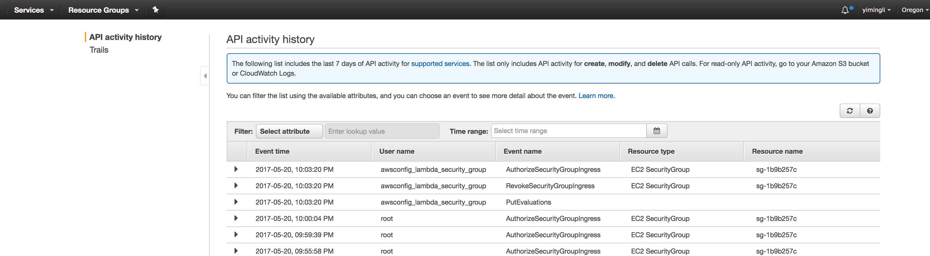 AWS CloudTrail 将记录账户上的用户 API 活动,将保存有关 API 操作的完整详细信息,如发起人的身份、该 API 调用的时间、请求参数和 AWS 服务返 。AWS Config 与AWS CloudTrail 集成 ,回答“谁进行了修改此资源的 API 调用?”例如下图, 使用集成的 AWS CloudTrail 信息,可以发现是哪个用户错误配置了安全组。
