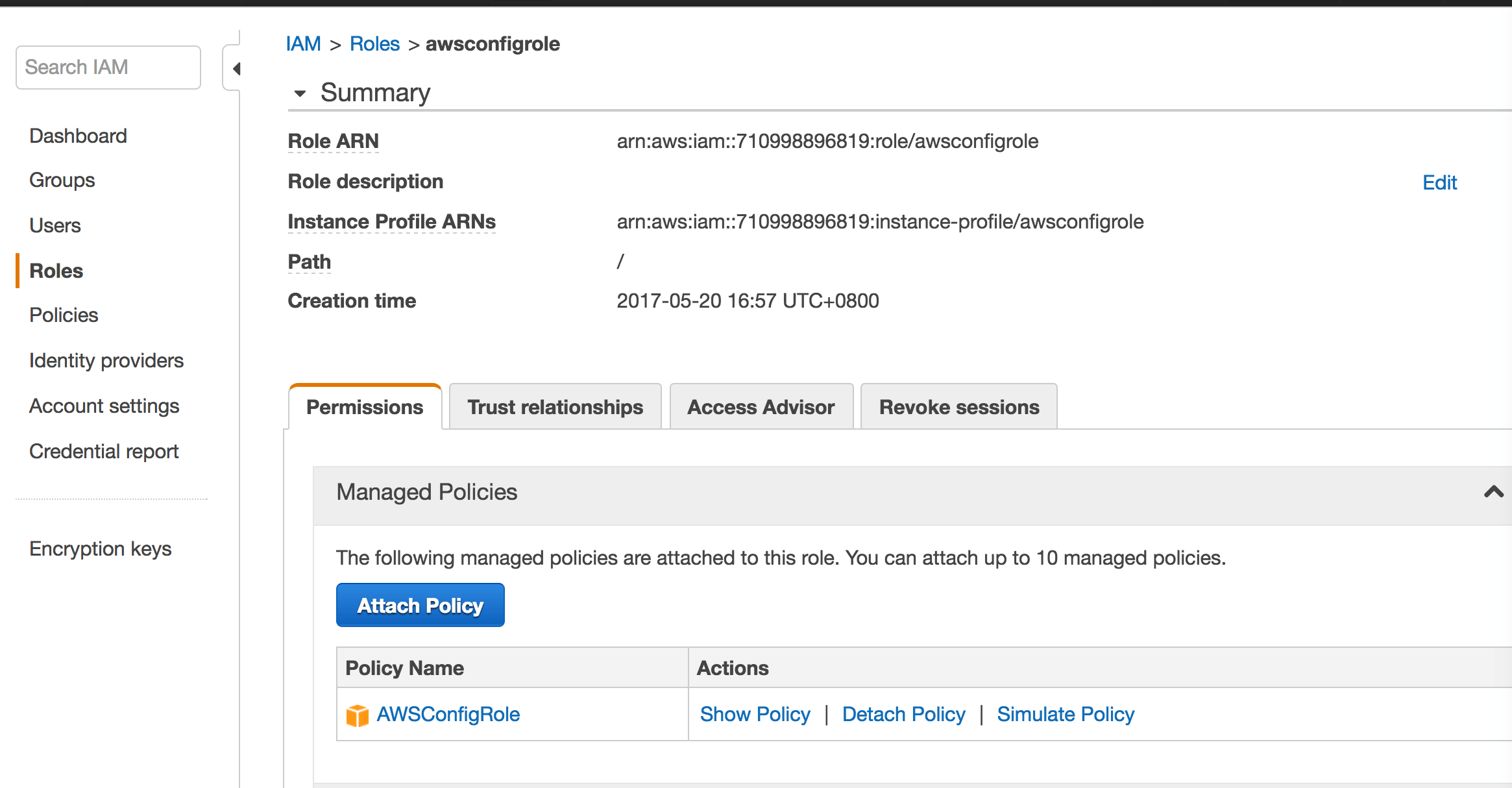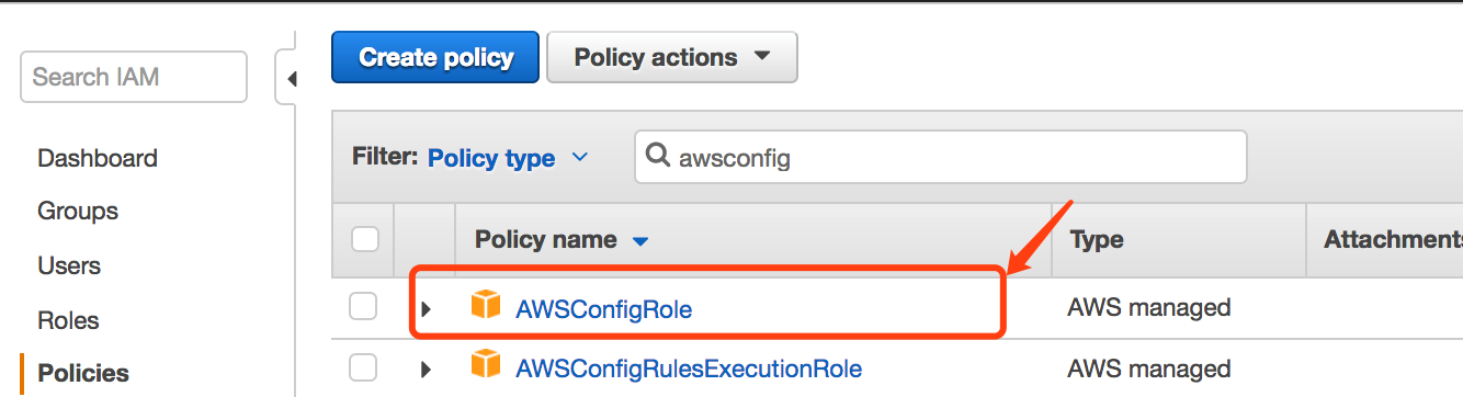 新建一个IAM Role 命名为awsconfigrole, 可以直接附加该策略: