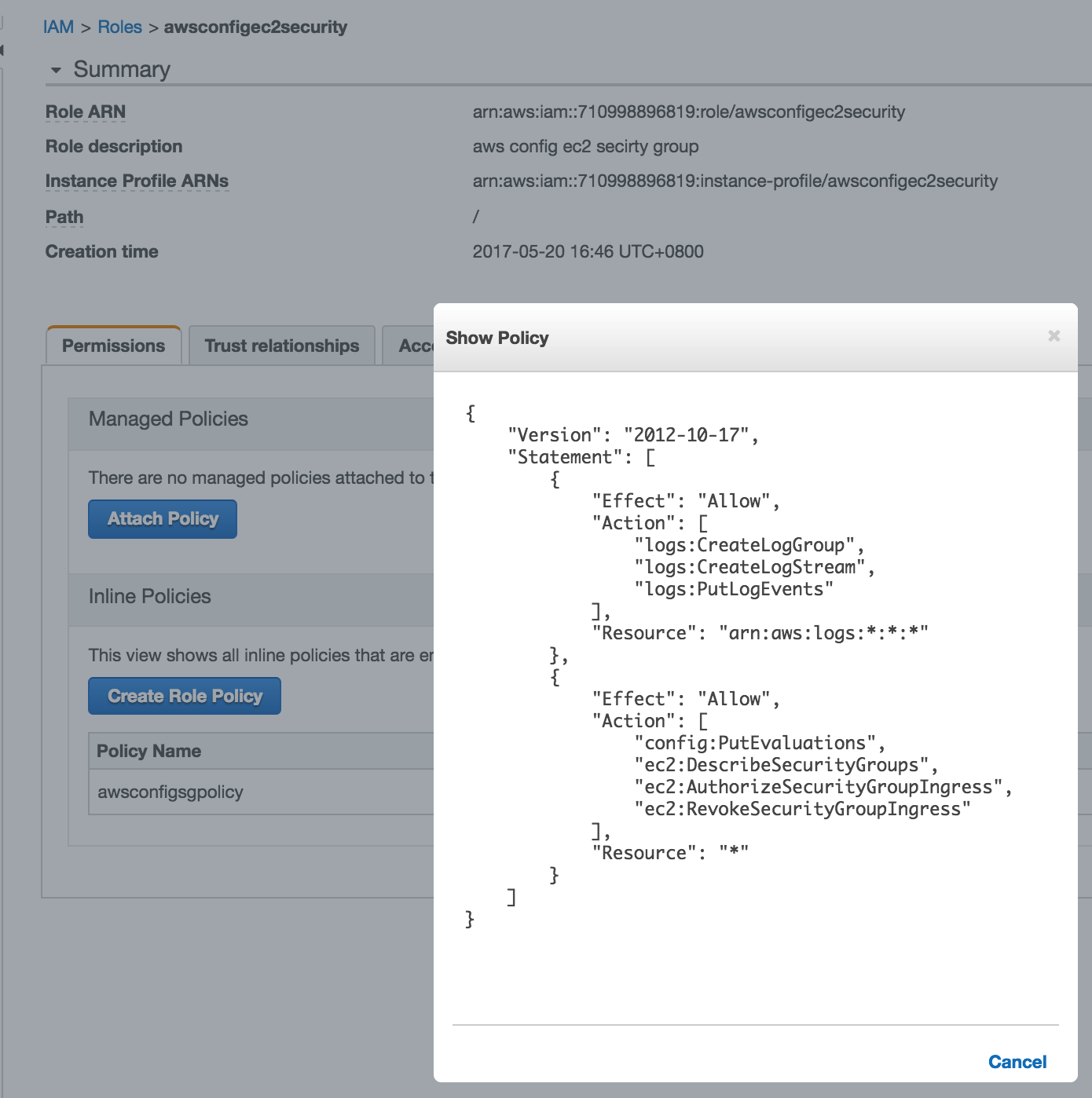 20170613-3另外,测试过程中将使用lambda自动对安全组执行安全组操作,cloudwatch log操作,也需要建立好对应的IAM role并编辑策略赋予对应的权限,在测试中该IAM role为:awsoncifgec2security