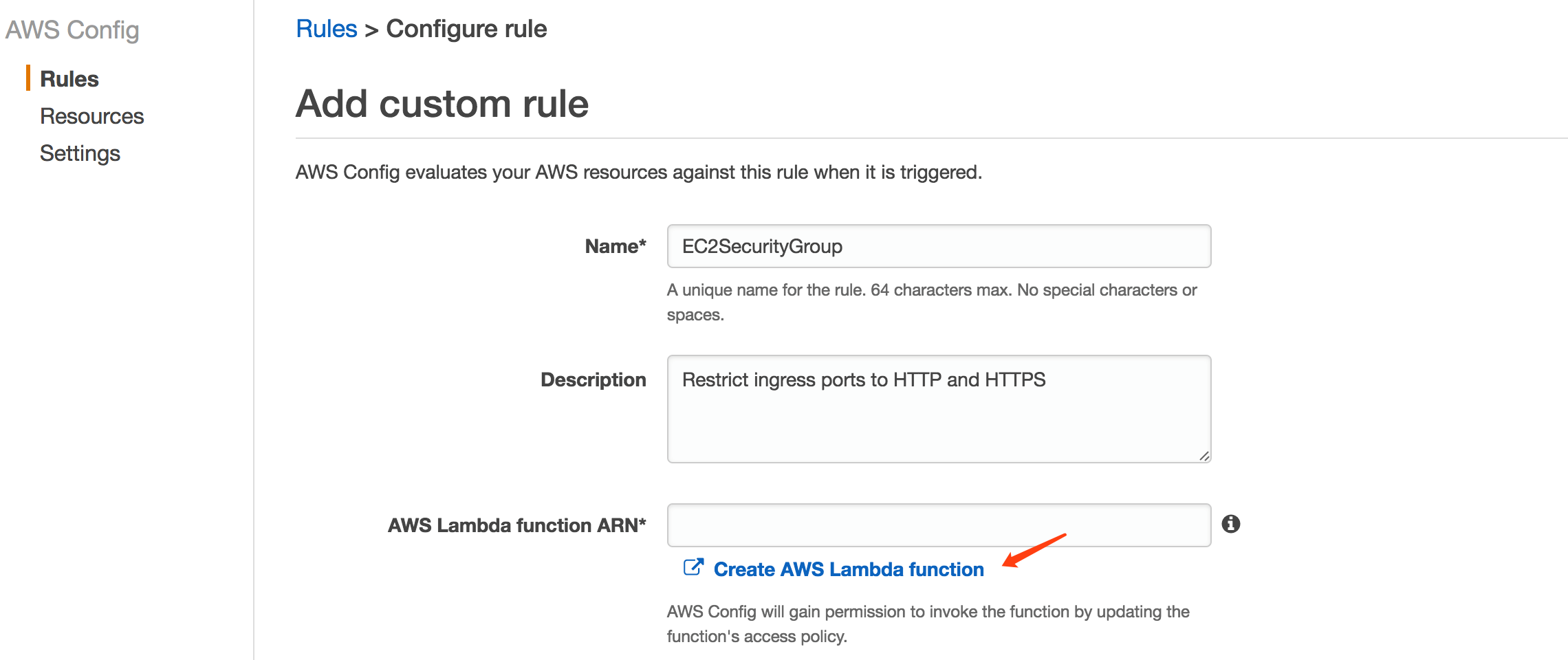 c. AWS Config 规则配置。AWS Config提供一些内置的规则,也支持自定义规则创建。在前文中提及测试的背景中需要通过自动机制保证安全组规则符合设定的合规配置,我们将通过lambda完成该步骤。在创建规则的过程中,按向导设置规则名称,点击新建lambda功能按钮: