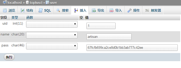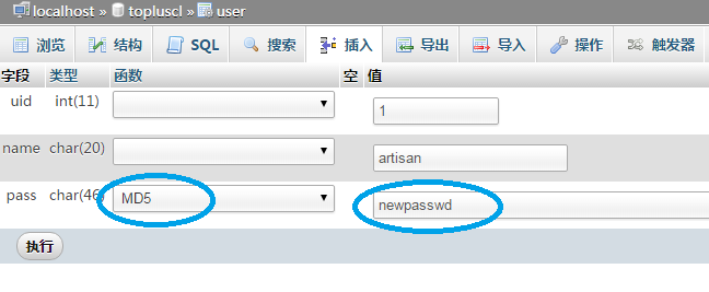 UPDATE `topluscl(数据库名)`.`user(表名)` SET `pass(密码选项名称)` = MD5(加密模式)( '新密码' ) WHERE `user`.`uid` =1;