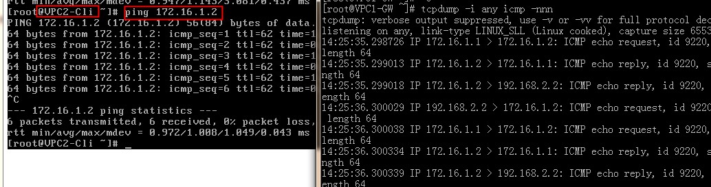 [root@VPC2-GW ~]# iptables -t nat -I POSTROUTING -s 172.16.2.0/24 -d 172.16.1.0/25 -j SNAT --to 192.168.2.2 |