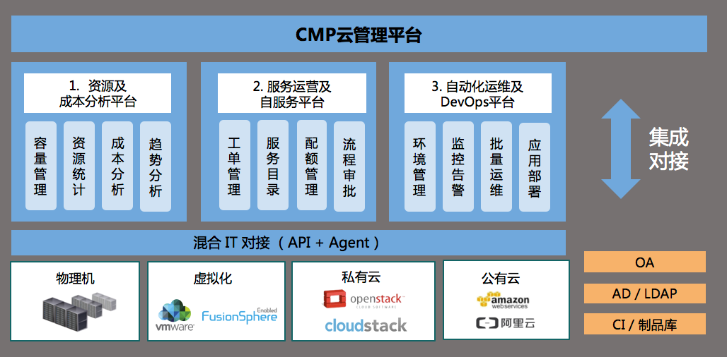 云管理平台的定义是Gartner提出来的,总结起来就是两块,第一是管理,管理公有云、私有云,形成混合云。第二是自服务,镜像划分,计量与计费,以及基于策略的负载优化。云管理平台最终的目标是应用在云平台上运行时取得最优化的效果。
