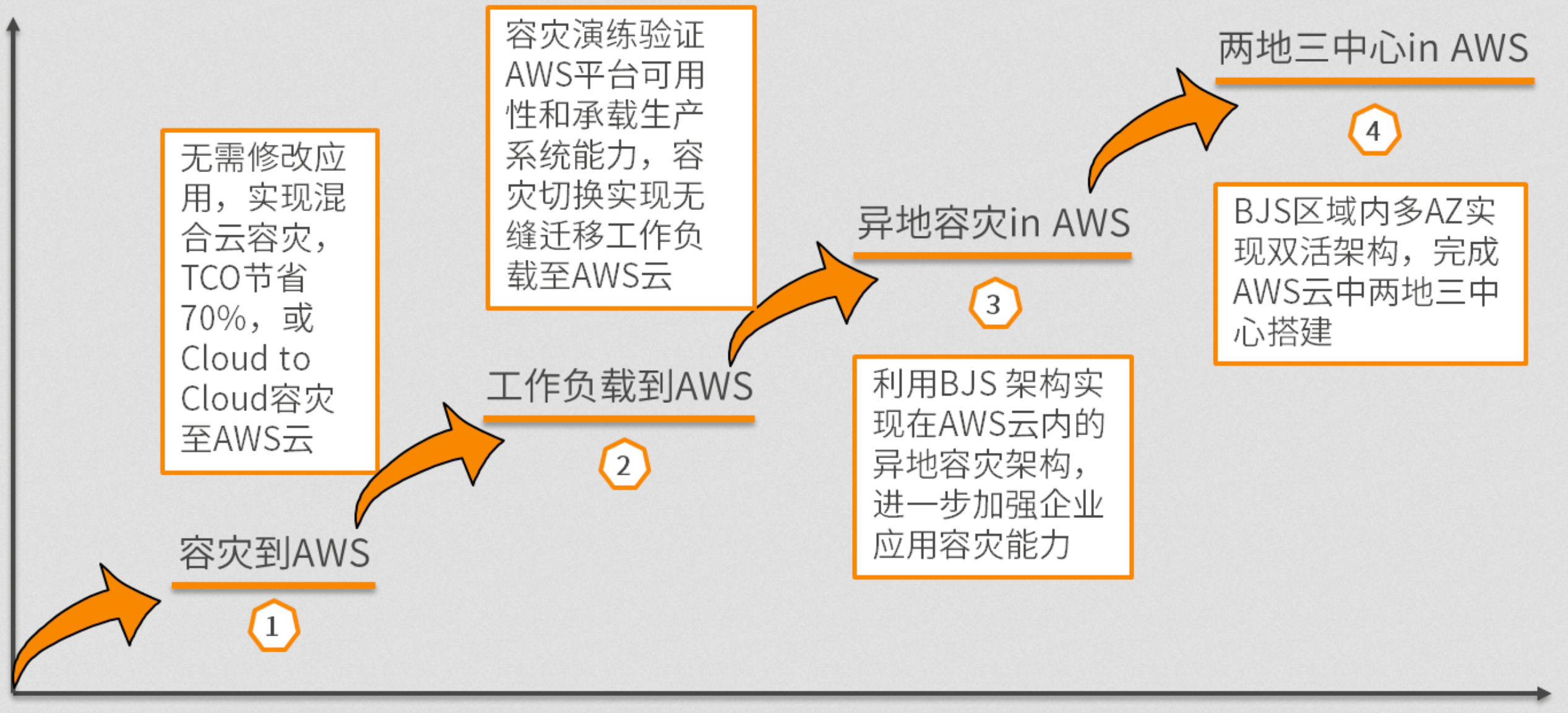 另外,随着应用容灾系统迁移至AWS云中,可以将企业现有的容灾中心转变成生产中心,从而扩大客户自建数据中心的承载能力,或大幅降低IT资源的运营成本,享受更多AWS云带来的好处。下图从AWS混合云容灾开始,到容灾切换,到生产系统平滑上云的进阶演进图: