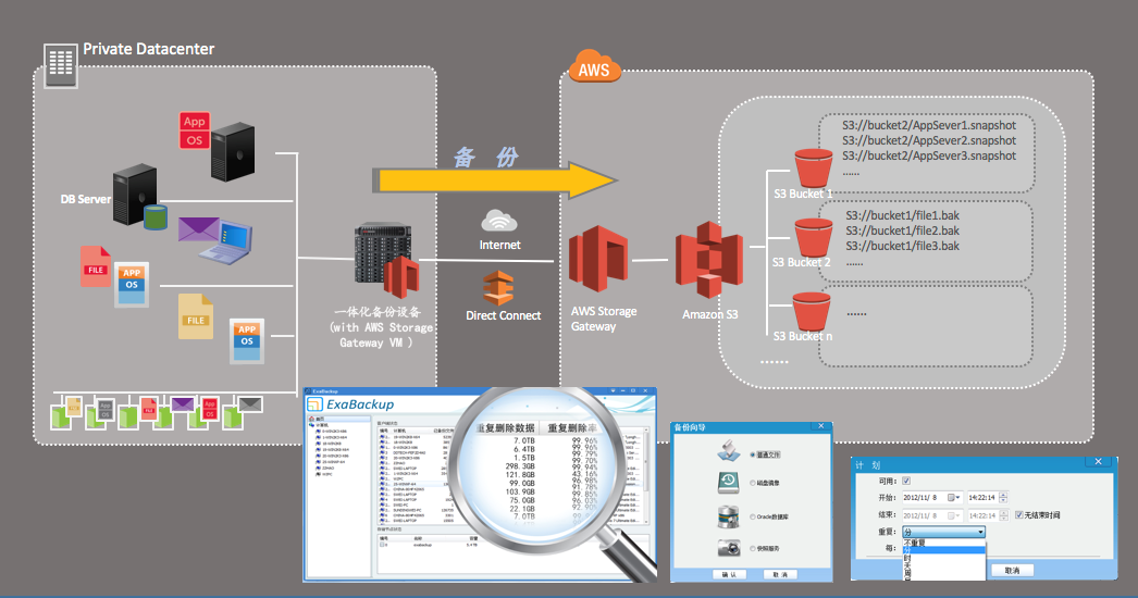 目前已经有很多国内外备份服务厂商基于AWS存储网关构建了一体化AWS混合云备份方案,利用AWS云存储资源便宜的特点帮助企业用户实现AWS云端备份,而且方案能很好的满足前述提到用户对混合云备份的要求。下图为国内某备份服务厂商基于AWS存储网关的混合云备份解决方案。