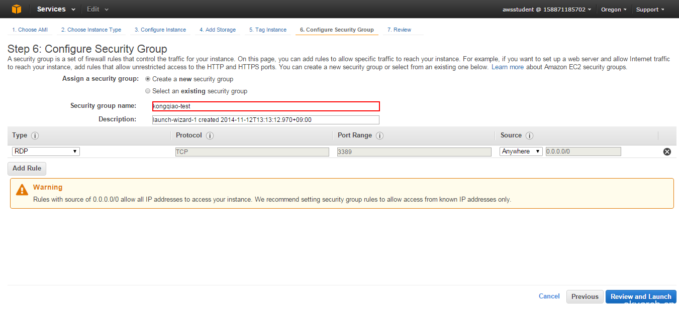 8. 这里很重要,选择「Create a New Security Group」,填写合适的安全组名字。这里为「fuwuqi120-test」, 而且下面设有默认的「RDP 0.0.0.0/0」安全组,也就是说,不管是谁只要知道该实例的IP,账户,密码都可以登陆。如果设定特定IP登陆的话, 在Source Anyware的地方,可改为Costume IP,仅仅允许特定的IP进行登陆(以后也可以变更),之后选择「Review Launch」进行下一步。