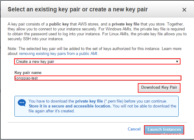 10.创建生成密码用的密钥,选择「Create a New key pair」创建密钥,这里为「fuwuqi120-test」,点击「Down load key pair」,名字为「fuwuqi120-test.pem」的文件被下载到本地。然后点击「Launch Instances」进行下一步。