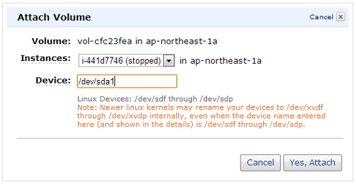 然后,把刚才通过快照作成的卷连接到EC2实例。