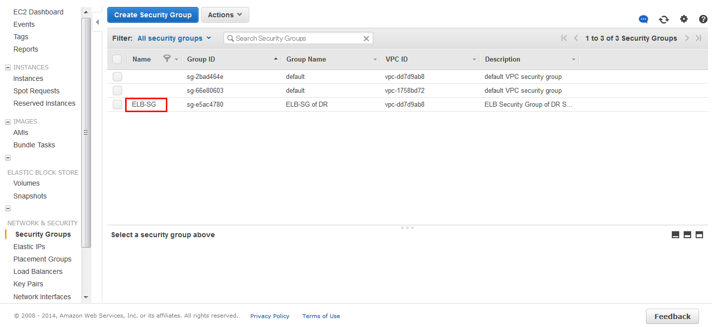EC2「Security Groups」中,下记6个安全组的状况确认;