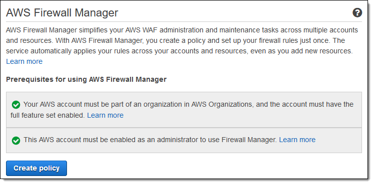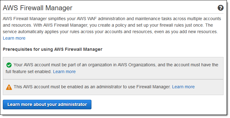 由于我没有自己的企业,因此由我的同事帮我创建一些测试账户!当我在主账户中打开 Firewall Manager 控制台时,我可以看到关于前两个前提条件的基础: