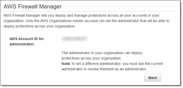 Firewall Administrator – 您必须指定组织中的一个 AWS 账户作为 Firewall Manager 的管理员。这样将赋予该账户在组织中部署 AWS WAF 规则的权限。