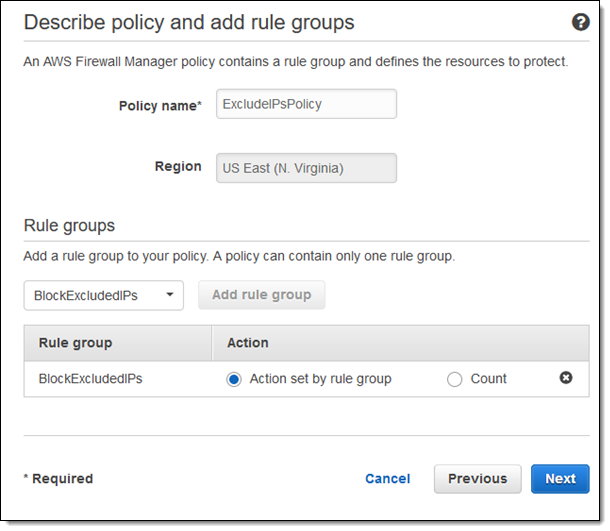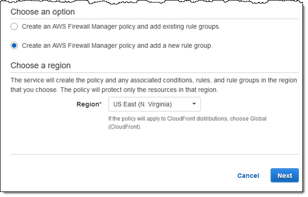在页面底部,我选择为美国东部(弗吉尼亚北部)地区创建新策略和规则组,并单击“下一步”: