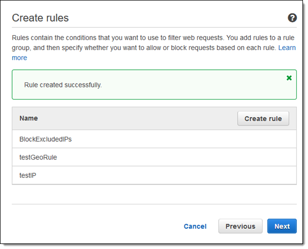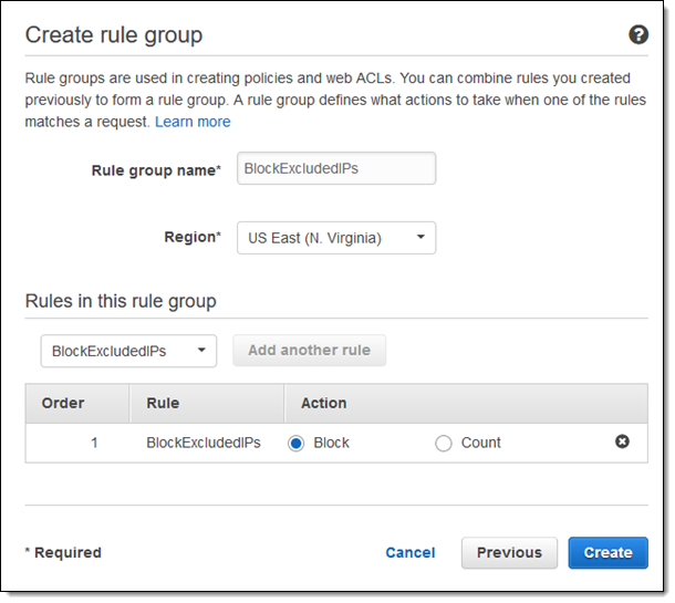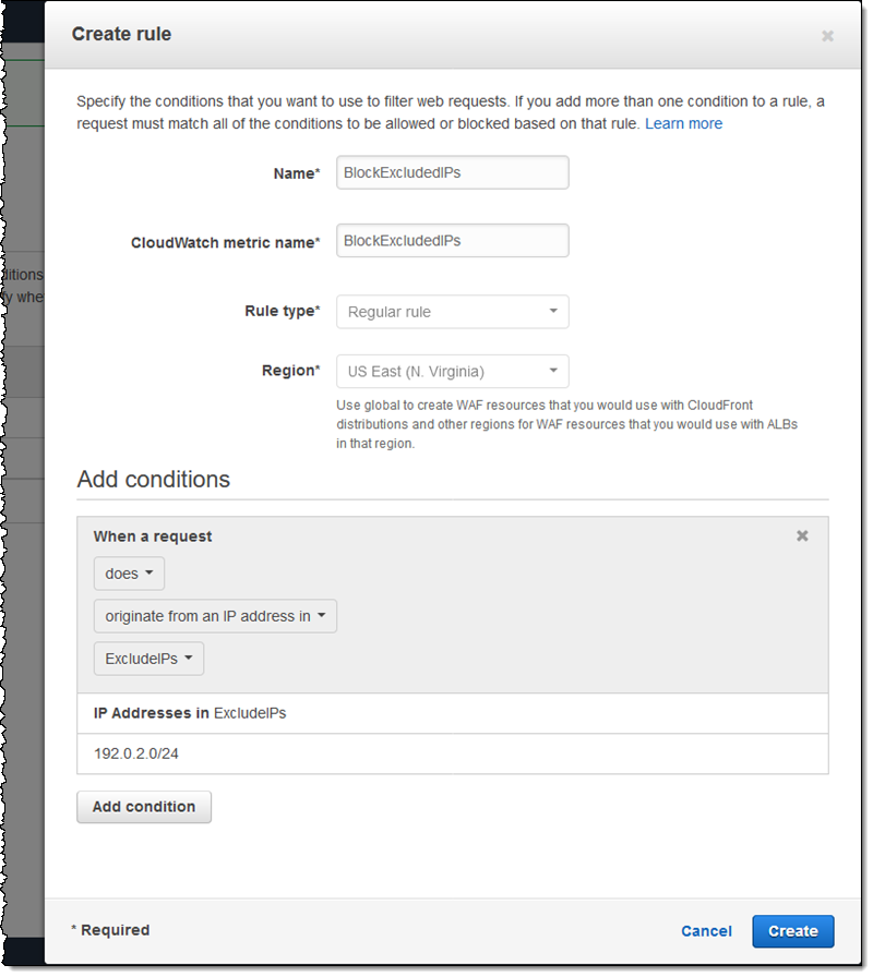 我为自己的规则命名 (BlockExcludedIPs),输入 CloudWatch 指标名称,并添加我的条件 (ExcludeIPs),然后单击“创建”: