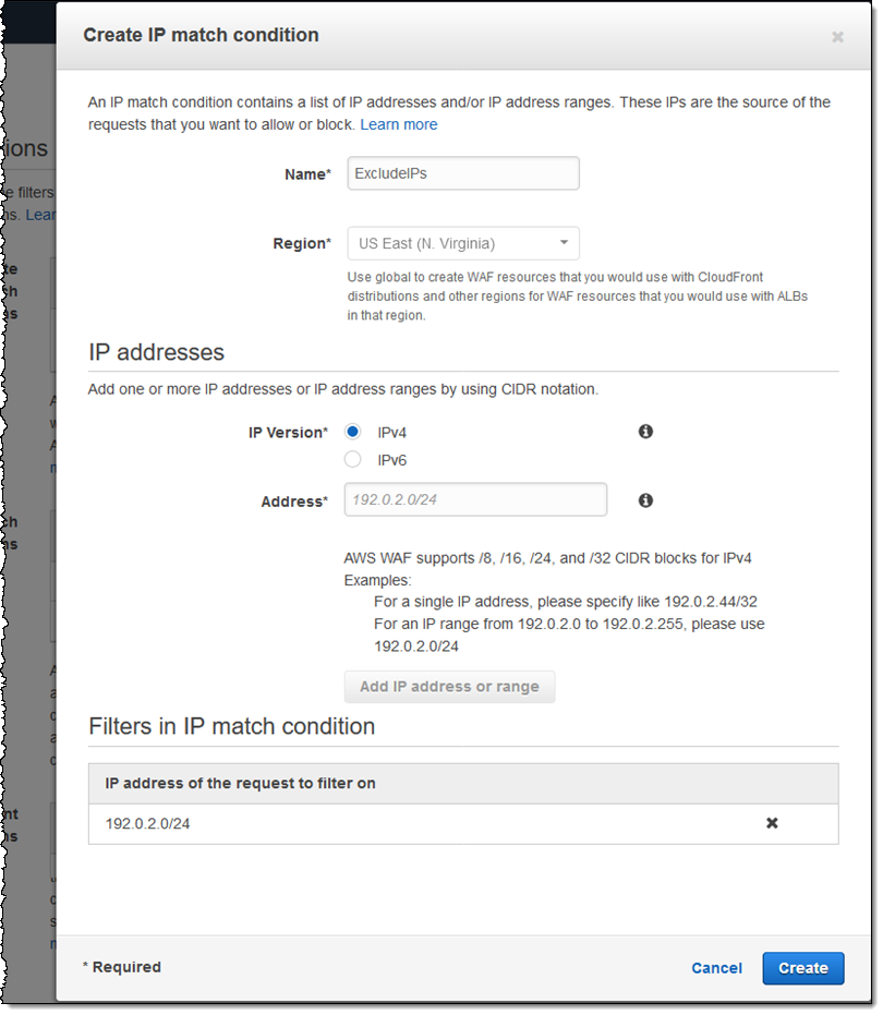 例如,我可以创建阻挡恶意 IP 地址的条件(此 AWS 解决方案为您展示如何将第三方声誉列表用于 WAF 及其益处):