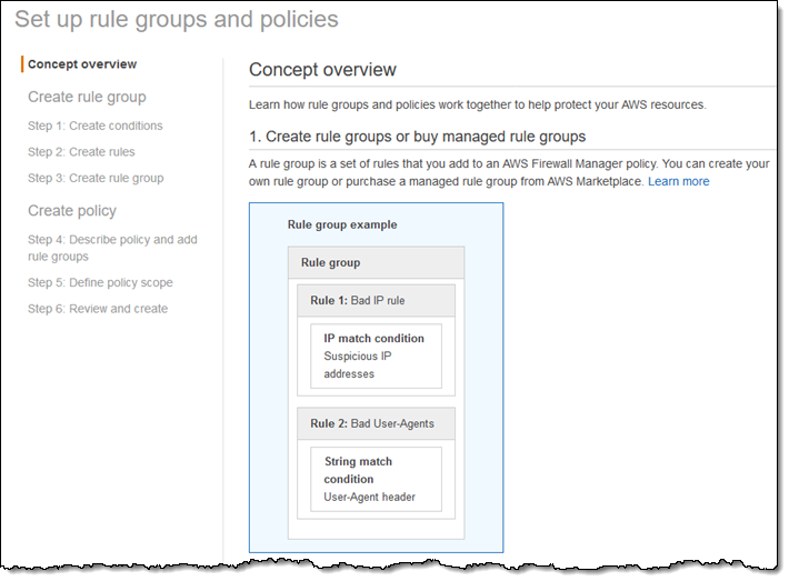 控制台为我提供了流程概要。我需要创建规则和规则组,定义包含规则组的策略,定义策略范围,然后实际创建策略。
