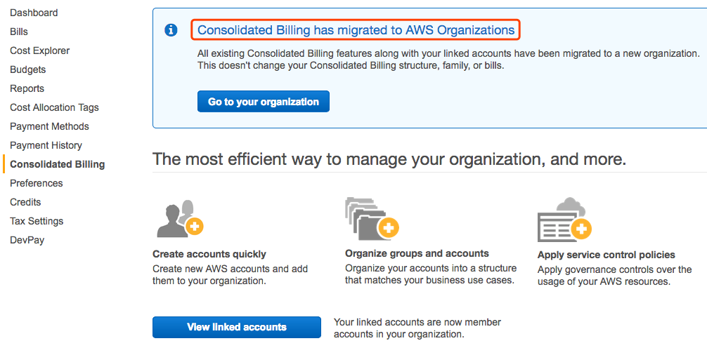 注意:现在Consolidated Billing功能已经迁移到AWS Organization下了,如果点击主账号下的My Account-> Consolidated Billing,可以看到该提示,并且点击View Linked accounts也是直接就会跳转到AWS Organization界面