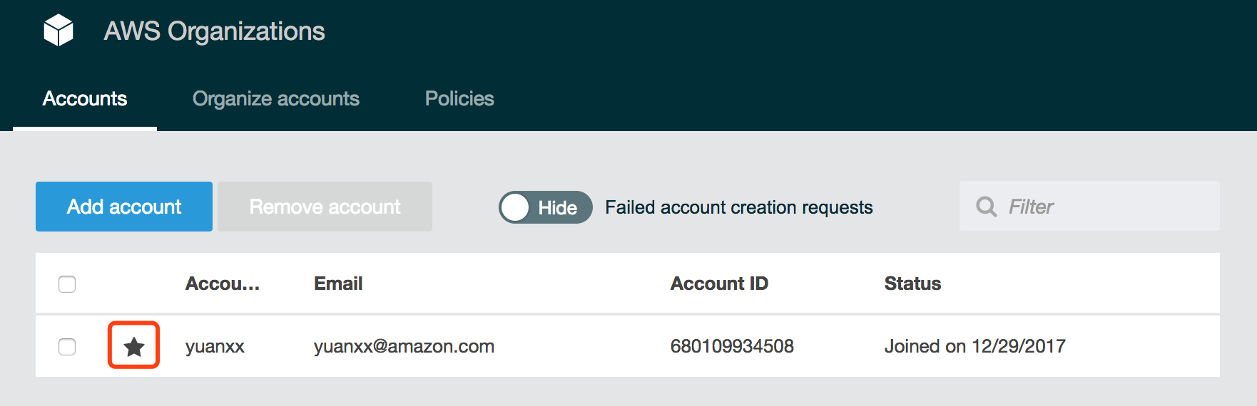 创建完毕之后,会出现组织架构管理界面,前面带星号的账号就是Master Account