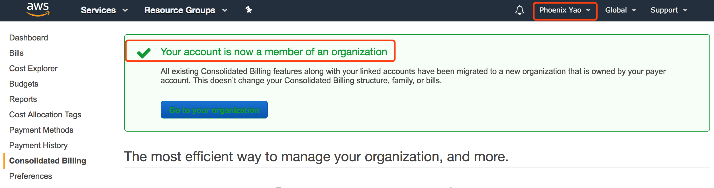登录账户之后,可以看到这个新账号已经可以工作,并且Consolidated Billing功能是默认开启的。并指示该账户已经在一个Organization下了。