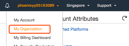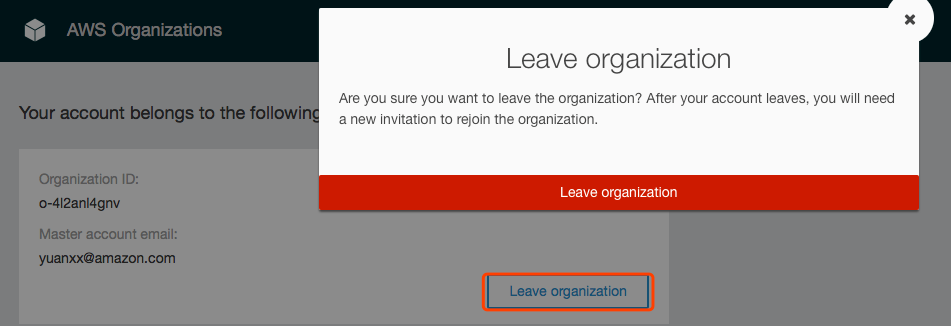 2. 加入Organization的Account脱离Organization,在该Account下选择My Organization,可以看见其加入的Organization信息以及选择离开该Organization