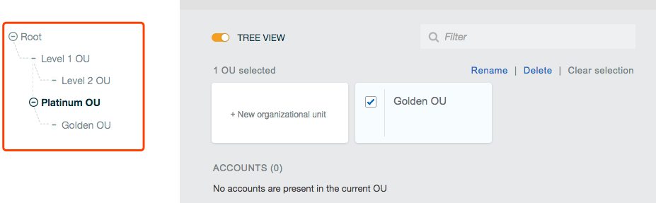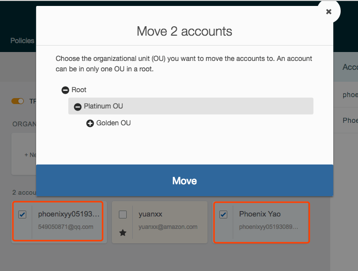 所有的Account默认都在根OU下,你可以选择一个或者多个Account,并把他们移动到任意OU下。目前只能移动Account到OU,不能从OU主动加Account