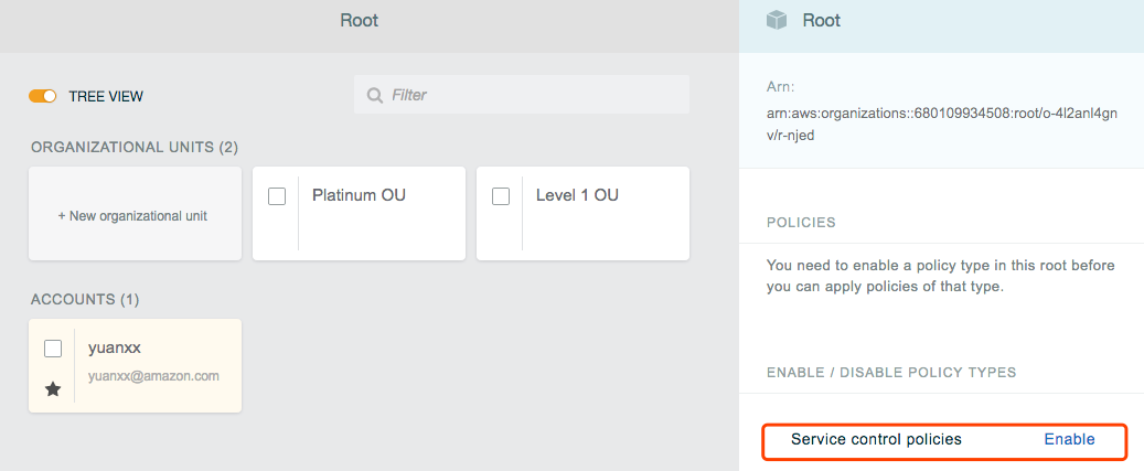 针对不同的OU可以开启不同的Policy来控OU下面的Account,不过要开启这个feature,必须首先在Root OU下启动这个功能