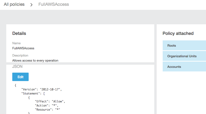 Service Control Policy在Policies下面可以进行设置,默认情况就有一个什么权限都有的FullAWSAccess Policy并且是attach到Root OU的。这也就意味着默认情况下,只有有Account加入这个Organization,那么这个Account就拥有操作所有AWS服务的权限。如果希望修改SCP,那么可以点击右侧的Policy editor进行修改