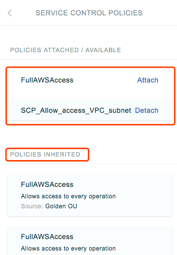 SCP的格式和IAM Policy格式一致,但有下面两点不同。在修改完或创建完Policy之后,可以attach给任何OU或Account