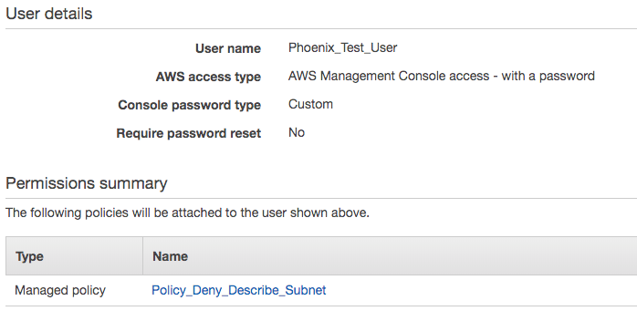 我们再来看下IAM policy和SCP一起作用的结果。使用Phoenix Yao这个root账号创建一个User,并赋予其除了查看Subnet其余动作都可以做的IAM Policy。