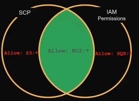 一定注意,允许最终用户行为的话,必须要SCP和IAM Permission同时拥有。下图所示,如果在SCP允许S3和EC2,但是在IAM Permission允许EC2和SQS。那么最终用户只能拥有EC2的权限。