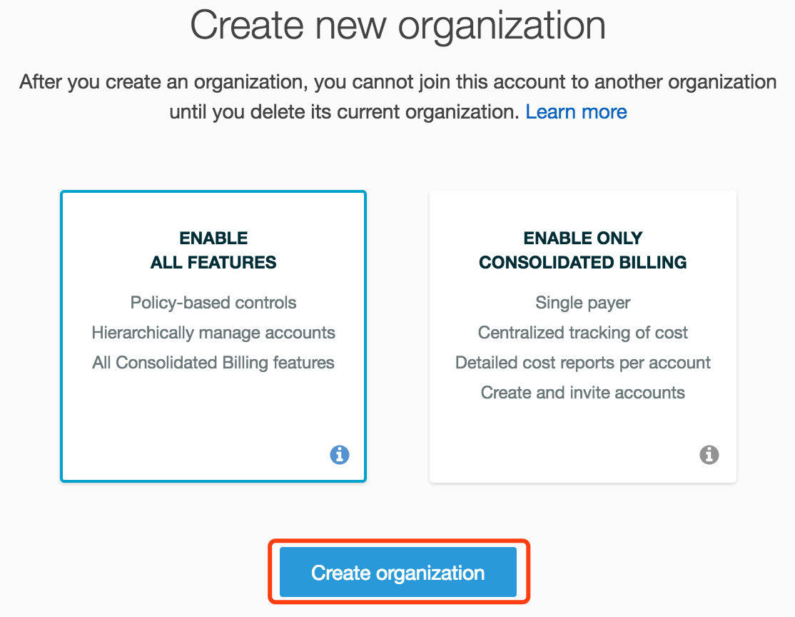 在AWS Organizations服务界面上选择创建组织,选择希望创建的组织的种类,这里我演示时选择Full Control模式,如果希望仅进行账单整合(Consolidated Billing),那么选择右边的“Enable Only Consolidated Billing”。无论是哪种模式,账单都会是整合的。区别只在于Master Account能不能对加入的账号进行控制