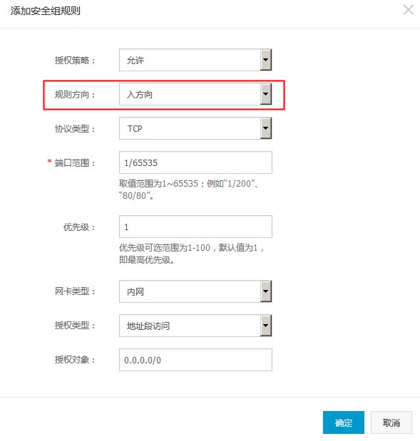 添加安全组配置规则时,规则方向需要选“入方向”,网卡类型选“内网”: