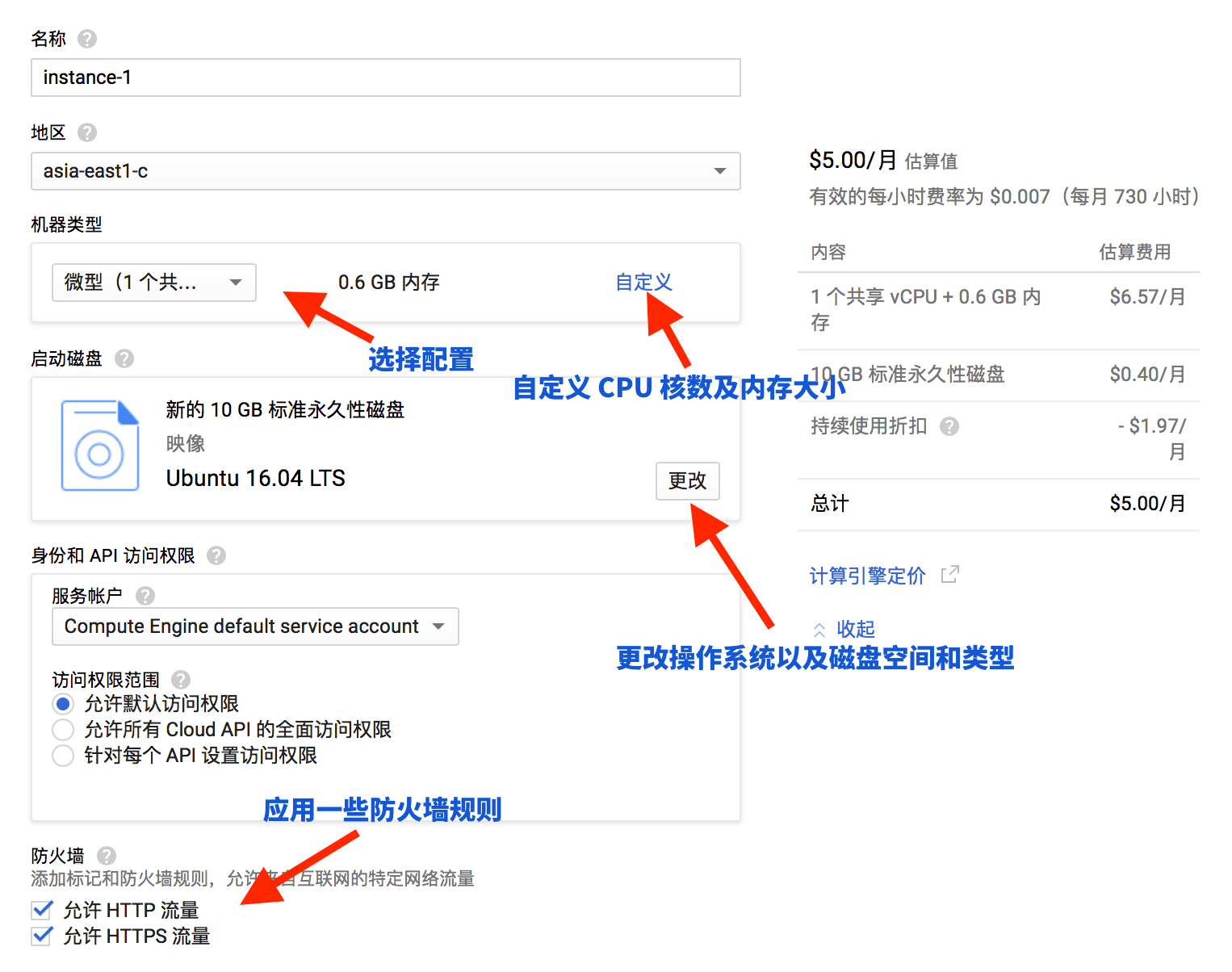 GCE 的价格比较亲民,最低配 1 共享核-0.6 GB 内存-10GB HDD 每月只需要不到 5 美元,而且由于 CPU、内存大小和磁盘大小都是可调的,所以可以根据自己的需要去购买最适合的,能省去不必要的开销。