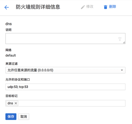 如果配置了目标标记,那么就不是默认应用到所有实例的防火墙规则,还需要在实例上配置好同样的标记才可以。