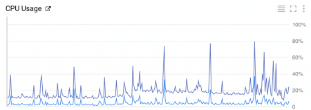 我的 f1-micro 装了监控软件,对比 GCE 给的 CPU 占用率(深蓝色)和系统自己监控到的占用率(浅蓝色),发现 GCE 图表上统计的 CPU 占用率正好是本地统计的 5 倍,也就是说如果本地看到的 CPU 占用是 20%,GCE 图表上显示的就正好是 100%,本地为 20~100%,GCE 图表上就是 100~500%,这时就算作 Bursting 了。