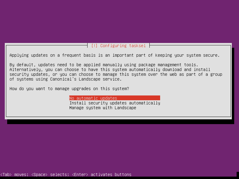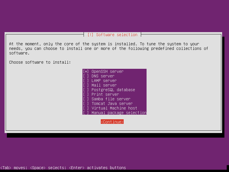 - 默认只需要选择SSH服务,保证我们在安装后能够SSH登陆服务器即可