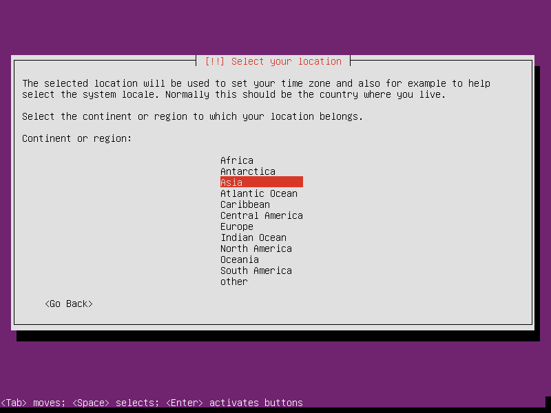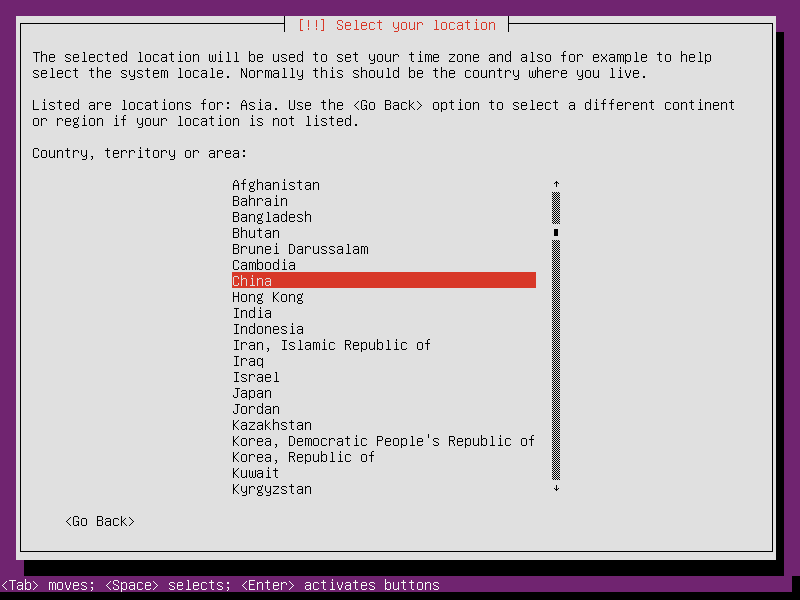 - Location一定要选择中国,否则默认不会使用中文的Ubuntu源,影响安装速度,这一步很多初学者不会在意