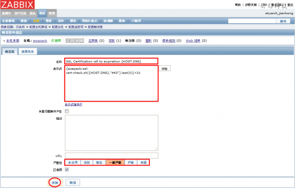 和创建监控项时一样,在主机页面点击「触发器」->「创建触发器」之后,填写如下内容并点击「添加」。